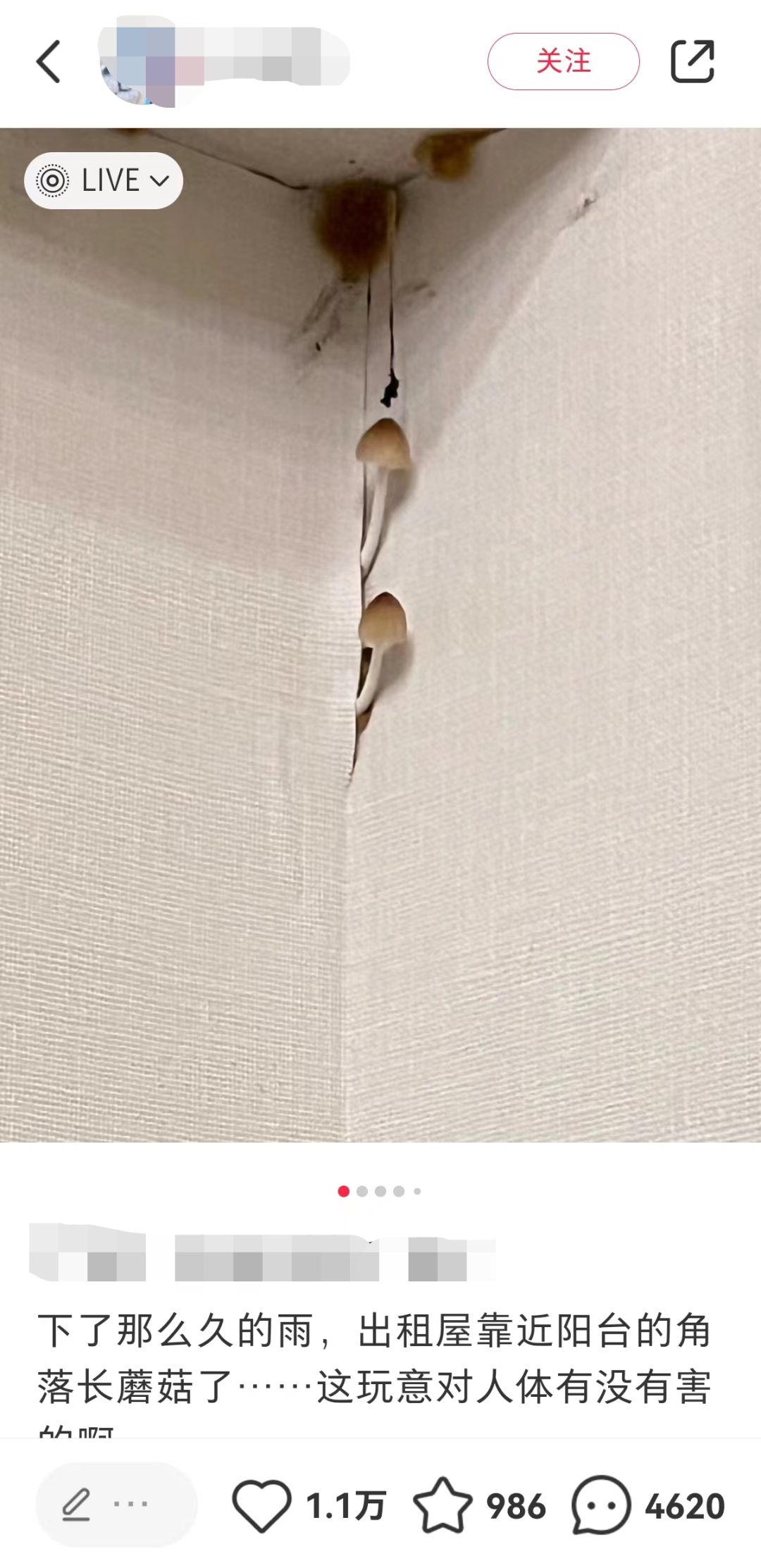 甚至有人家里不见阳光的阴角还会长出蘑菇,如下图所示: