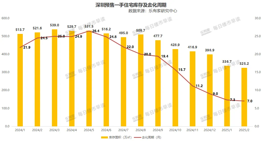 自去年9.29后,深圳新房快速去化,库存量快速减少。根据房地产中介机构乐有家统计的数据,截至今年2月底,深圳一手预售住宅库存量为30385套,去化周期从去年5月高峰的26个月,降至7个月。