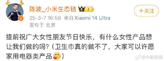 此前,网友曾多次喊话小米和雷军推出卫生巾产品。对此,3月7日,小米生态链总经理陈波在微博发文称:“提前祝广大女性朋友节日快乐,有什么女性产品想让我们做的吗?(卫生巾真的做不了,大家可以许愿家用电器类产品。)”