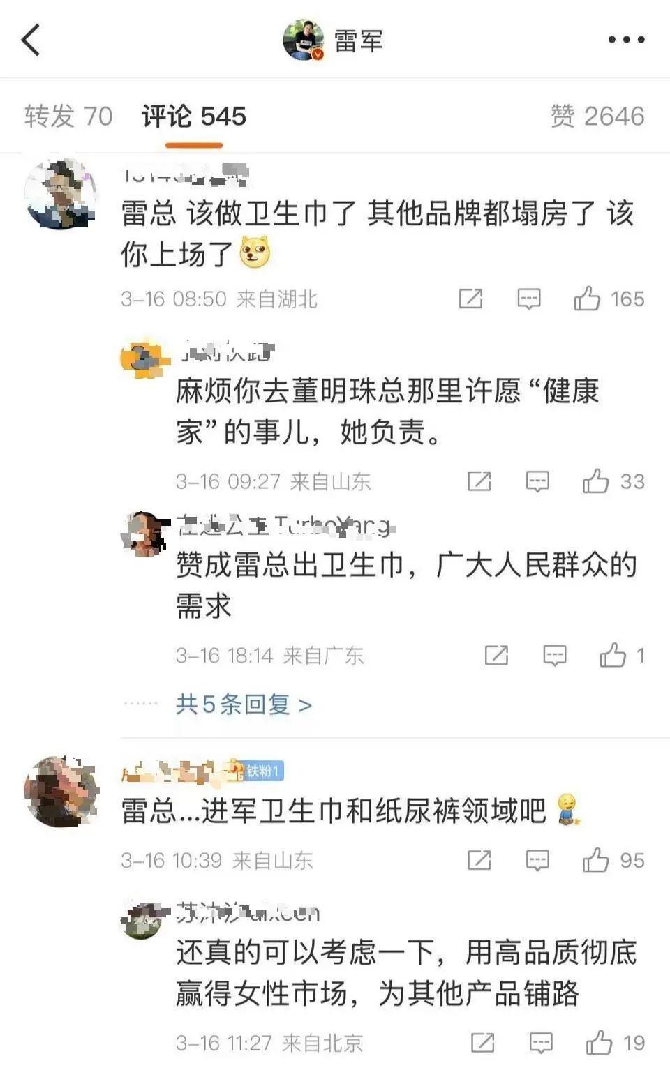 对此,众多网友纷纷跑到雷军微博评论区刷屏,希望小米能生产卫生巾和纸尿裤等产品。