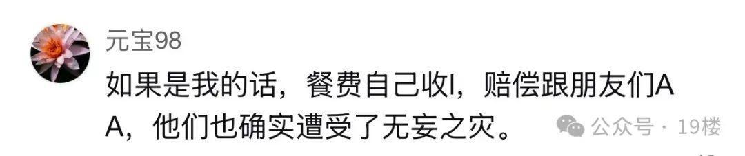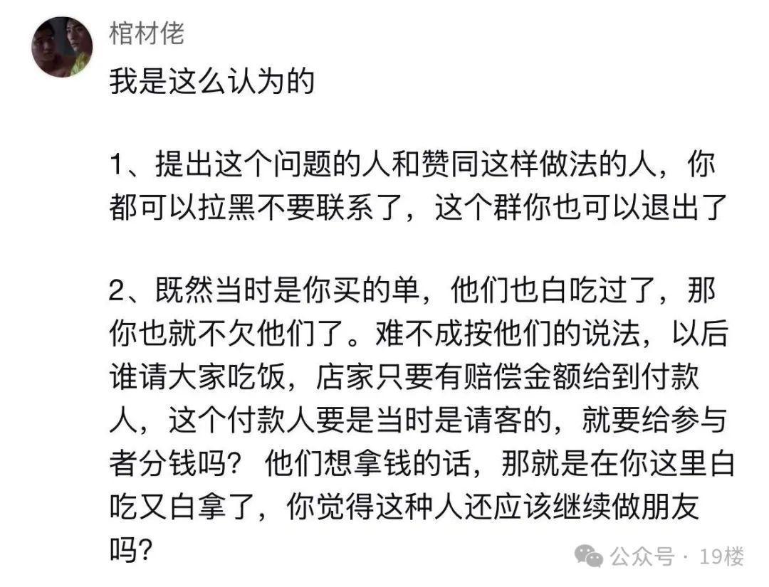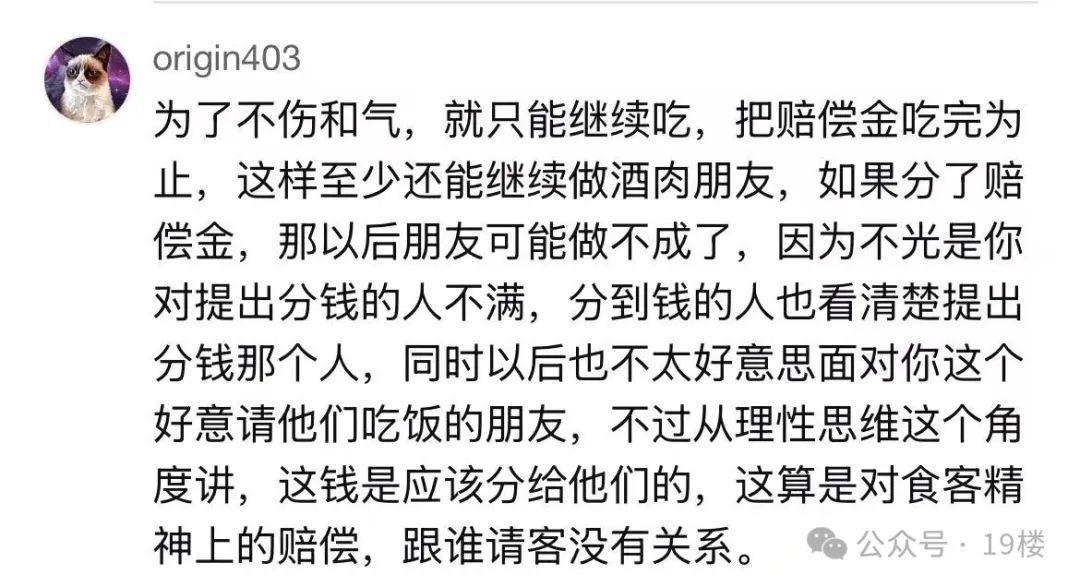 也有网友表示,当初是请朋友吃饭,理应所有的赔偿都归楼主,朋友强行要分赔偿的诉求不合理。