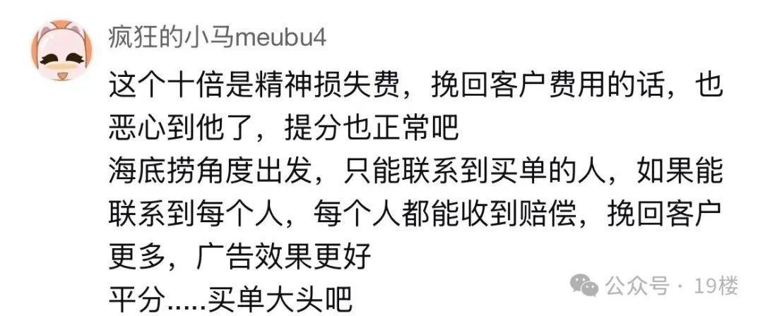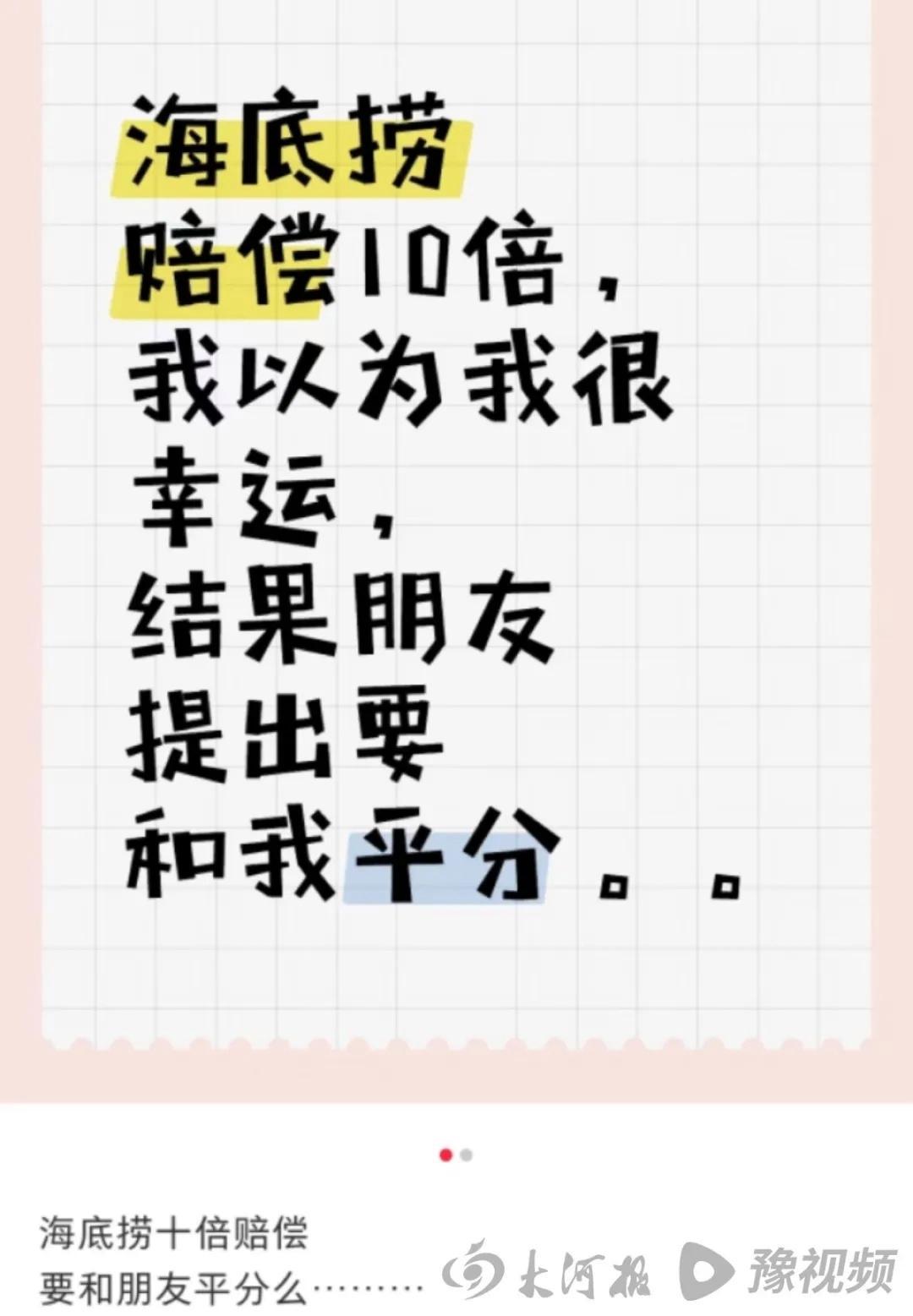 帖子引发了网友的热议。有网友表示,海底捞的十倍赔偿属于精神损失费,朋友也是受害者,会和他们AA赔偿款。
