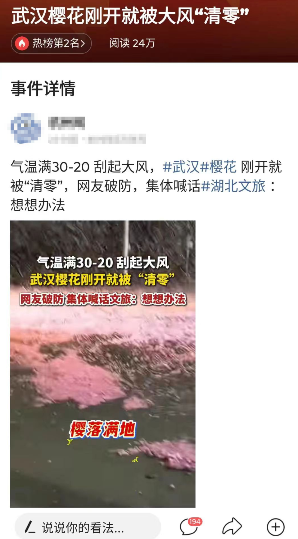 当日早间,有消息称,“武汉樱花刚开就被大风‘清零’”,还在中午登上了平台热榜第2名。
