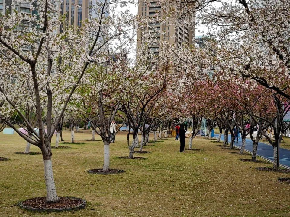 在广场内四百余株樱花树中,当前仍有大量半开及未开花苞。他们受到风雨的影响不大,依旧会陆续开放。