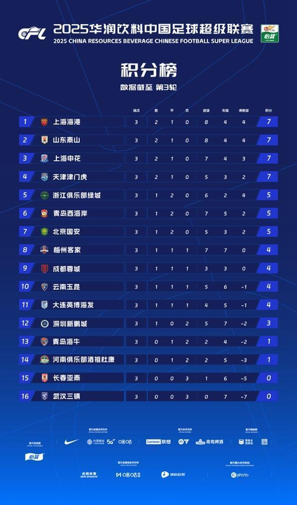 3轮过后泰山与海港、申花、津门虎同积7分,领跑积分榜