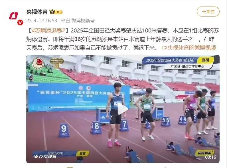 4月12日,2025全国田径大奖赛首站在广东肇庆举办,当天下午,男子100米半决赛终于开赛,不过,备受关注的“亚洲飞人”苏炳添弃权,未能出现在赛场上。