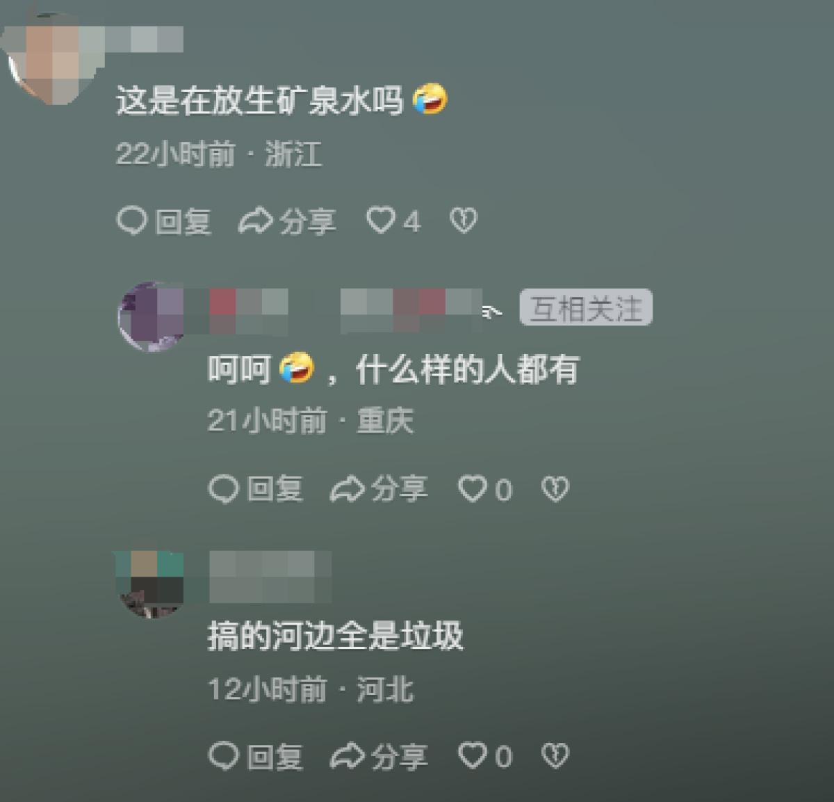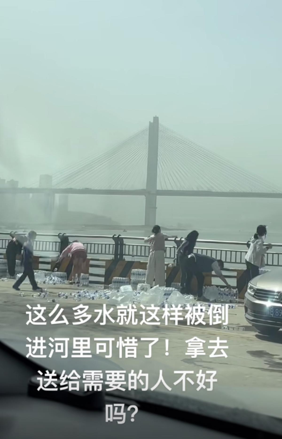 视频发布者称,这些人疑似在“放生”矿泉水,这些成件的矿泉水是刚被送到这里的,网友对倾倒矿泉水的行为表示不理解,称“拿去送给需要的人不好吗?”