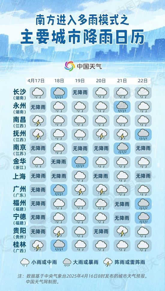 随着北方冷空气扩散南下,与暖湿气流汇合,今天起南方将进入多雨模式。16日至17日、18日至19日、20日至24日将有三轮降雨过程来袭,可谓无缝衔接。其中,后两轮降雨影响范围广、强度较大,局地雨势猛烈,可能伴有短时强降水、雷暴大风等强对流天气。