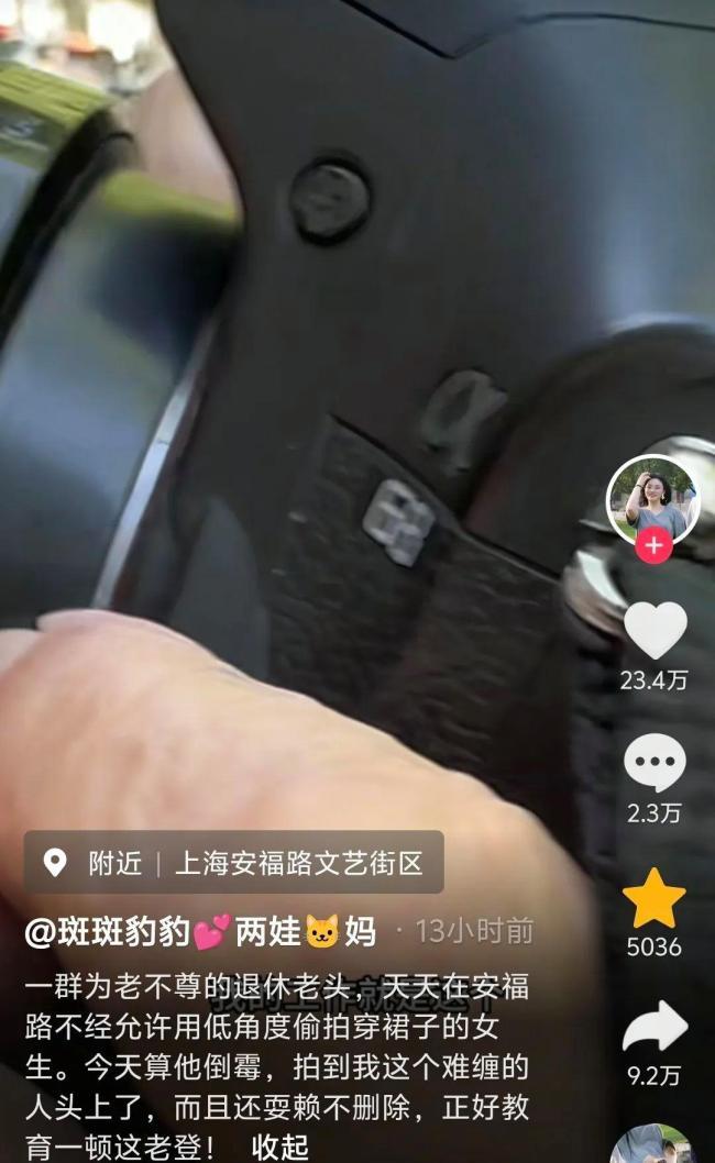 最近,一段上海女子在安福路上怒怼“老法师偷拍”的视频在网络上走红。这名女子在视频简介中写道:“一群为老不尊的退休老头,天天在安福路不经允许用低角度偷拍穿裙子的女生。今天算他倒霉,拍到我这个难缠的人头上了,而且还耍赖不删除,正好教育一顿这老登!”