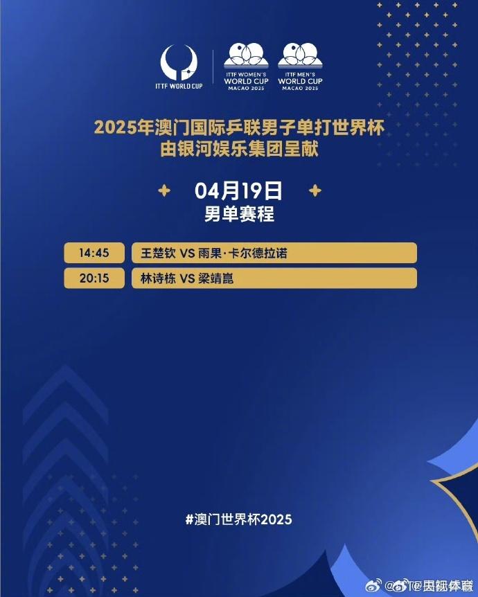 19日20:15,另一场半决赛将在林诗栋和梁靖崑之间展开,胜者将与雨果争夺男单冠军。