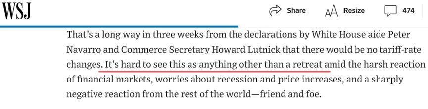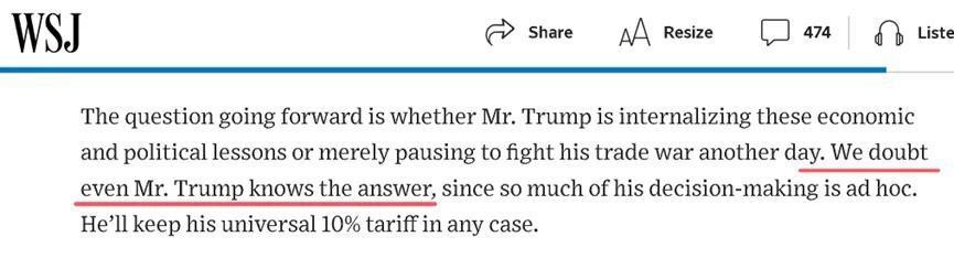 这篇社评中的核心观点其实很直白,认为自4月初宣布对全世界加征“对等关税”,并对中国进行极限施压以来,白宫在过去的这20多天一直在不断做出调整:先是给除中国以外的其他一些国家宽限90天,然后是给苹果、英伟达等大企业开后门,再到如今准备大幅减轻对中国的关税。