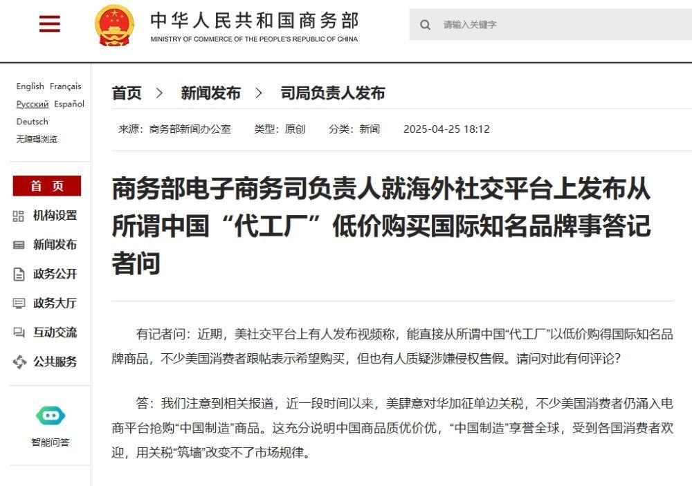 关于提到的有人声称能从所谓“代工厂”手中低价购买国际知名品牌,经向相关行业商协会了解,中国的品牌授权加工企业高度重视知识产权保护,会按照订购合同要求生产、发货,维护国际品牌形象。对以所谓“代工厂”为名虚假营销、侵权假冒等违法违规线索,我们将及时移交行政执法部门依法查处。