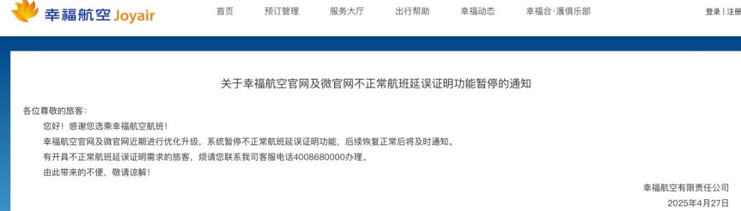 当晚,幸福航空官方网站发布《关于幸福航空官网及微官网不正常航班延误证明功能暂停的通知》,称近期进行优化升级,系统暂停不正常航班延误证明功能,后续恢复正常后将及时通知。
