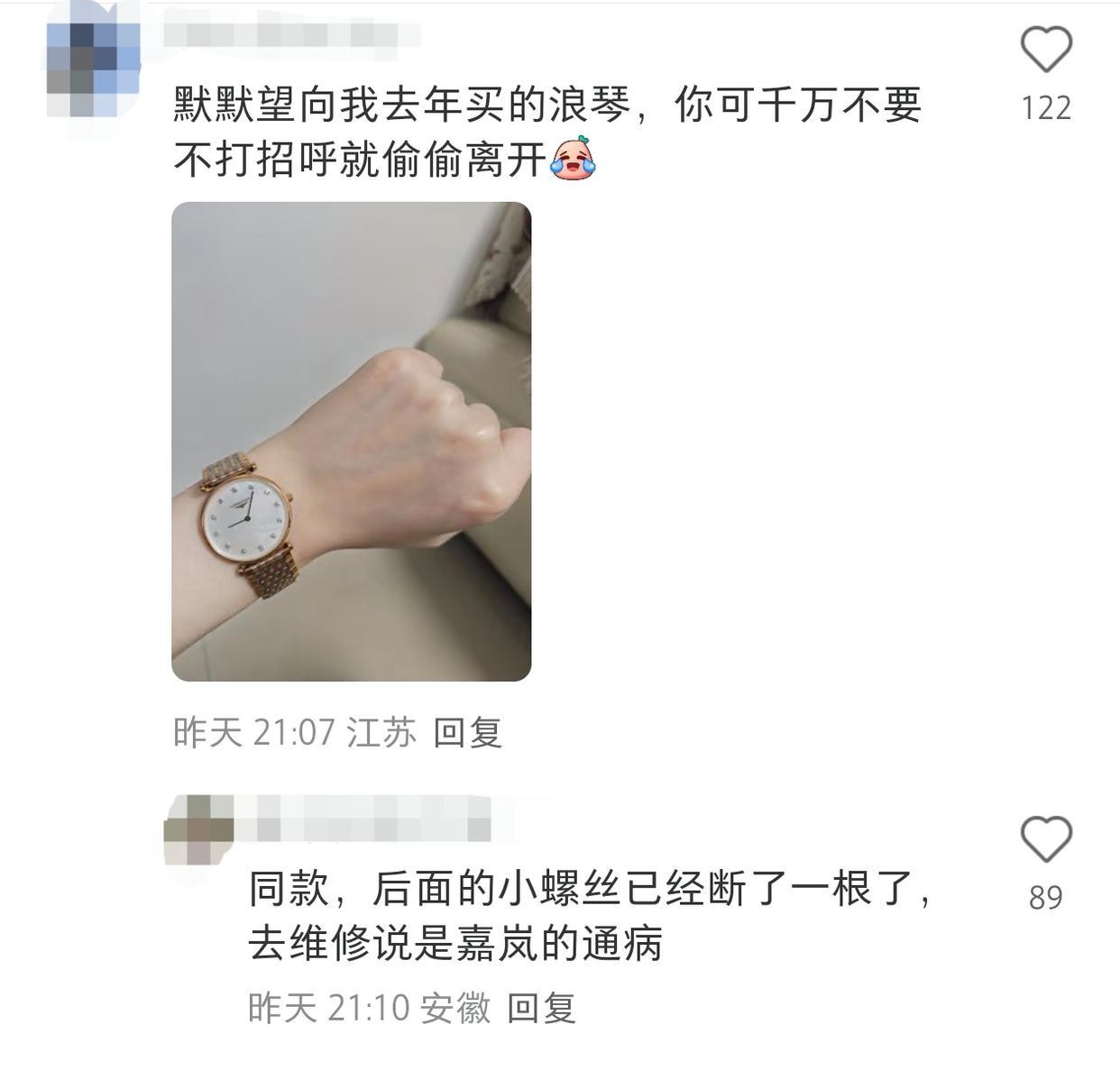 评论区里,一位北京的网友也晒出了同样的情况,并表示,“表盘离家出走让我猝不及防”。还有一位安徽网友表示自己也购买了浪琴“嘉岚系列”腕表,去更换电池时师傅发现了异常,“后面的小螺丝已经断了一根了”。评论区里其他购买了同系列腕表的网友也担忧自己的表会不会突然“浪还在,琴没了”。