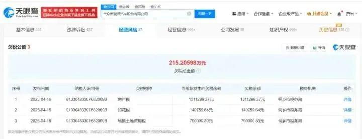4月25日,税务部门网站发布的欠税公告显示,哪吒汽车关联公司合众新能源汽车股份有限公司新增三则欠税公告,欠税总金额为215万余元。