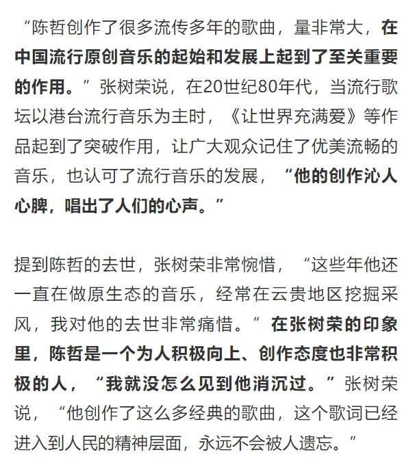 5月14日,著名词作家、音乐人陈哲因病在云南离世,享年71岁。他曾创作过《让世界充满爱》《同一首歌》《黄土高坡》等广为流传的歌曲。陈哲生前好友、中国音乐家协会流行音乐学会副主席张树荣感叹,“他的作品引领了中国歌坛的发展。”