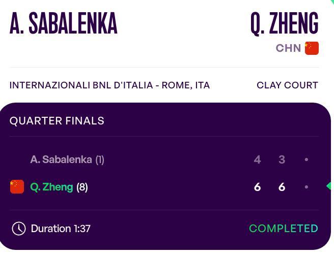 这是中国“金花”生涯首次击败萨巴伦卡,也是她首度闯进罗马站女单四强。
