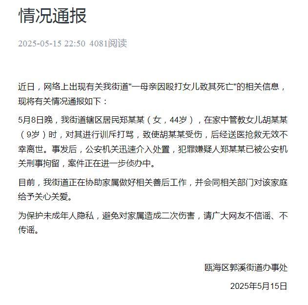 5月15日深夜,瓯海区郭溪街道办事处发布情况通报称,5月8日晚,街道辖区居民郑某某(女,44岁),在家中管教女儿胡某某(9岁)时,对其进行训斥打骂,致使胡某某受伤,后经送医抢救无效不幸离世。