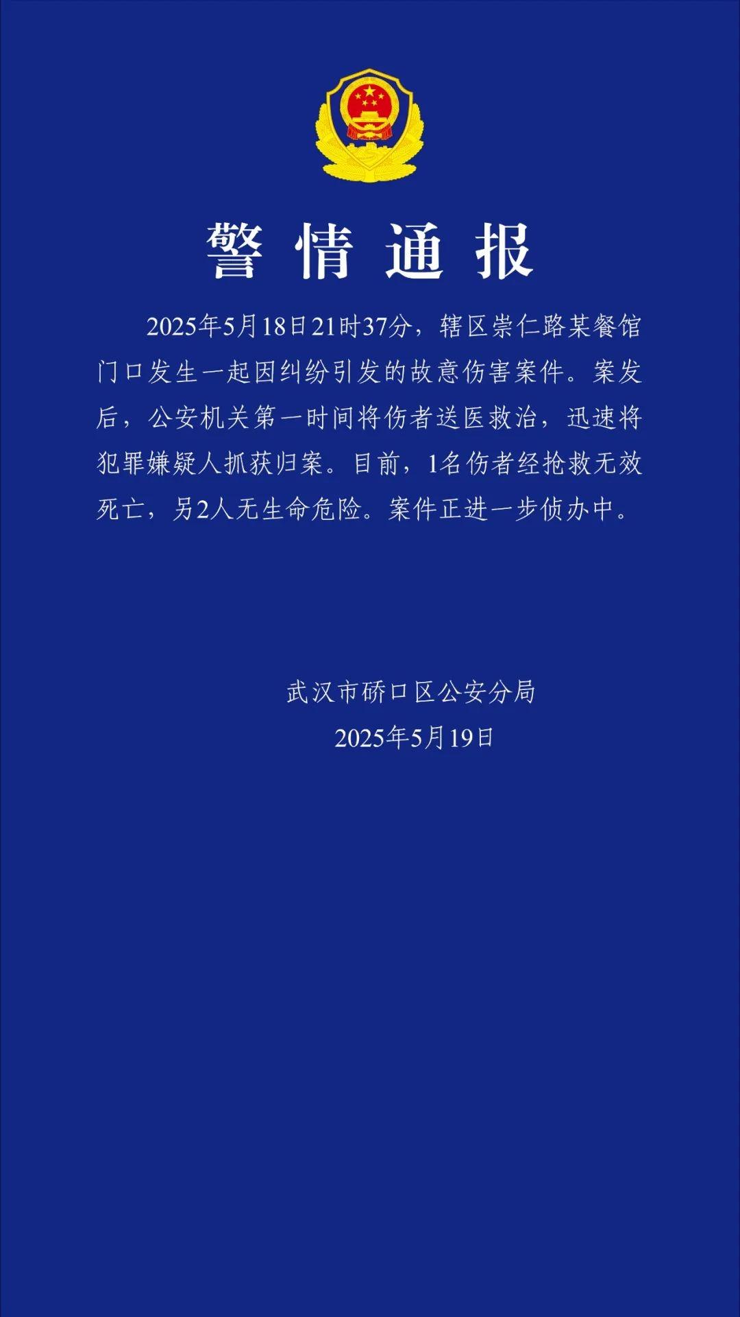 5月19日,武汉市硚口区公安分局发布警情通报:2025年5月18日21时37分,辖区崇仁路某餐馆门口发生一起因纠纷引发的故意伤害案件。案发后,公安机关第一时间将伤者送医救治,迅速将犯罪嫌疑人抓获归案。目前,1名伤者经抢救无效死亡,另2人无生命危险。案件正进一步侦办中。