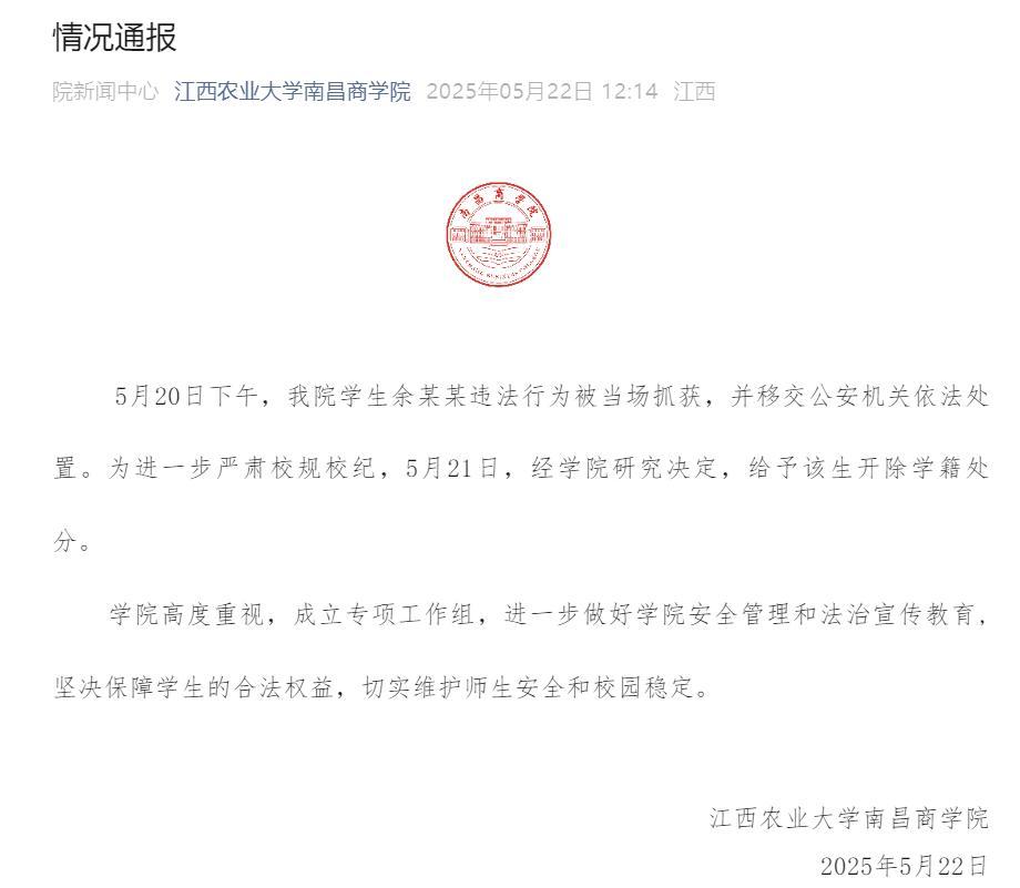 5月22日,江西农业大学南昌商学院发布情况通报称: