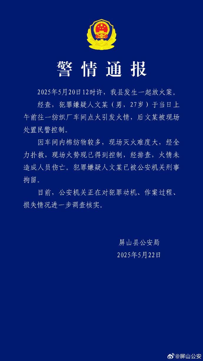 2025年5月20日12时许,屏山县发生一起放火案。