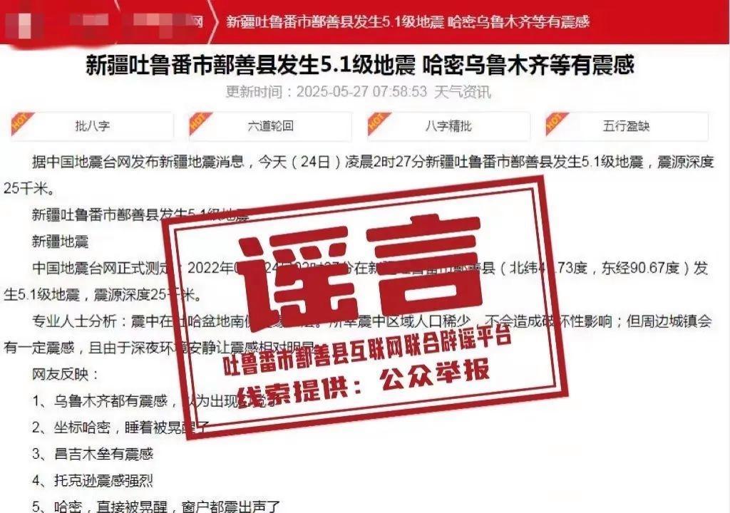 5月27日,某网站平台发布信息称:“新疆吐鲁番市鄯善县发生5.1级地震,哈密、乌鲁木齐等有震感”,引发社会关注。