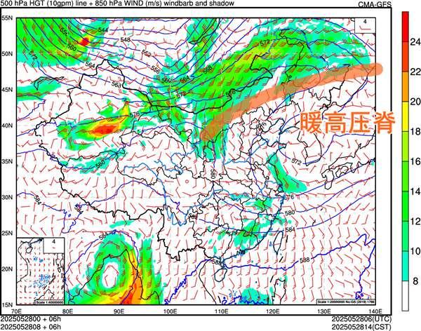 ↑上图橙色线条为高压脊位置示意