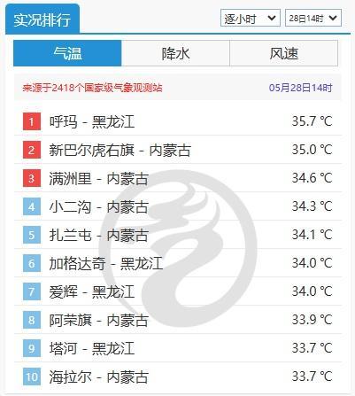 28日的气温榜真的给人一种错乱感。黑龙江呼玛、爱辉,内蒙古新巴尔虎右旗、海拉尔、满洲里…这好几个冬天低温榜的“常客”,却成了当日全国最热的地方。