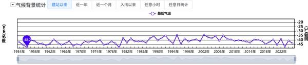 ↑黑龙江呼玛建站以来逐年最低气温,-40℃并不少见,其中-48.2℃为当地最低气温极值纪录。