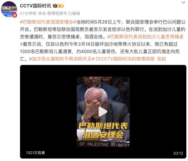 当地时间5月28日上午,联合国安理会举行巴以问题公开会。巴勒斯坦常驻联合国观察员曼苏尔发言控诉以色列罪行。在说到加沙儿童的悲惨遭遇时,曼苏尔悲愤捶桌,泪洒会场。曼苏尔说,仅自以色列今年3月18日破坏加沙地带停火协议以来,就已有超过1300名巴勒斯坦儿童遇害,约4000名儿童受伤,还有大批儿童正因饥饿走向死亡。