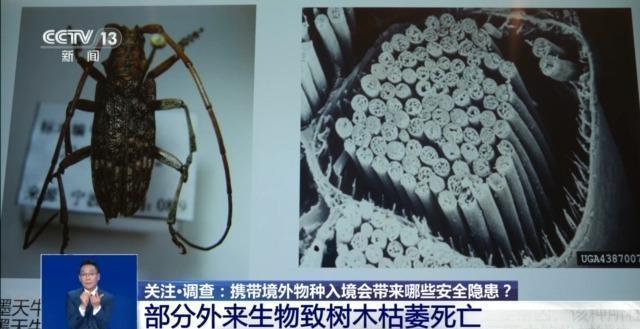 总台央视记者叶奂:在宁波海关国门生物安全展示馆里,展示着宁波口岸截获的各类外来生物标本。有种植物叫刺苍耳,原产于南美洲,它是一种典型的外来恶性杂草,全身带刺,它的刺容易对人和动物造成物理性伤害,而且伤口可能引发感染。在农田生态系统中,它通过迅速繁殖,入侵大豆、蔬菜等农作物,影响农业生产;另一方面它又表现出极强的竞争性和排他性,挤压其他植物的生存空间,从而导致生物多样性的下降。