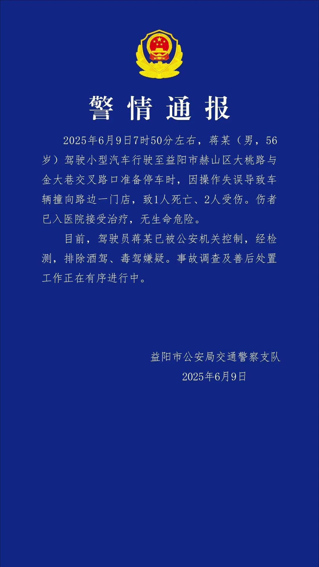 湖南益阳市公安局交通警察支队发布警情通报称,6月9日7时50分左右,蒋某(男,56岁)驾驶小型汽车行驶至益阳市赫山区大桃路与金大巷交叉路口准备停车时,因操作失误导致车辆撞向路边一门店,致1人死亡、2人受伤。伤者已入医院接受治疗,无生命危险。