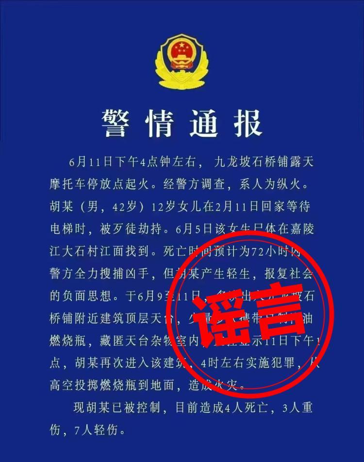 6月12日,网络上流传的一张假“警情通报”称“重庆九龙坡石桥铺露天摩托车停放点起火系人为纵火,造成4人死亡”。