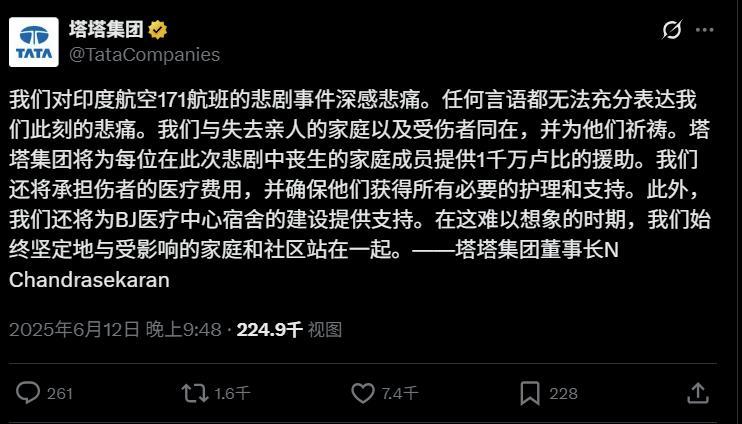 作为印度航空母公司,塔塔集团董事长N·钱德拉塞卡兰在声明中表示:“在这悲痛时刻,任何言语都难以表达我们的哀伤。集团将向每位遇难者家属提供1000万卢比(约合人民币84万元)的赔偿,并全额承担伤者的治疗费用。”
