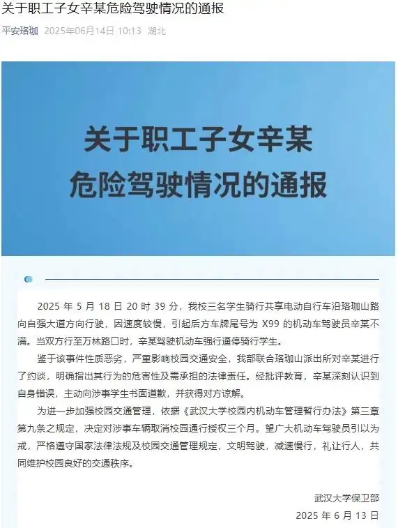 鉴于该事件性质恶劣,严重影响校园交通安全,我部联合珞珈山派出所对辛某进行了约谈,明确指出其行为的危害性及需承担的法律责任。经批评教育,辛某深刻认识到自身错误,主动向涉事学生书面道歉,并获得对方谅解。