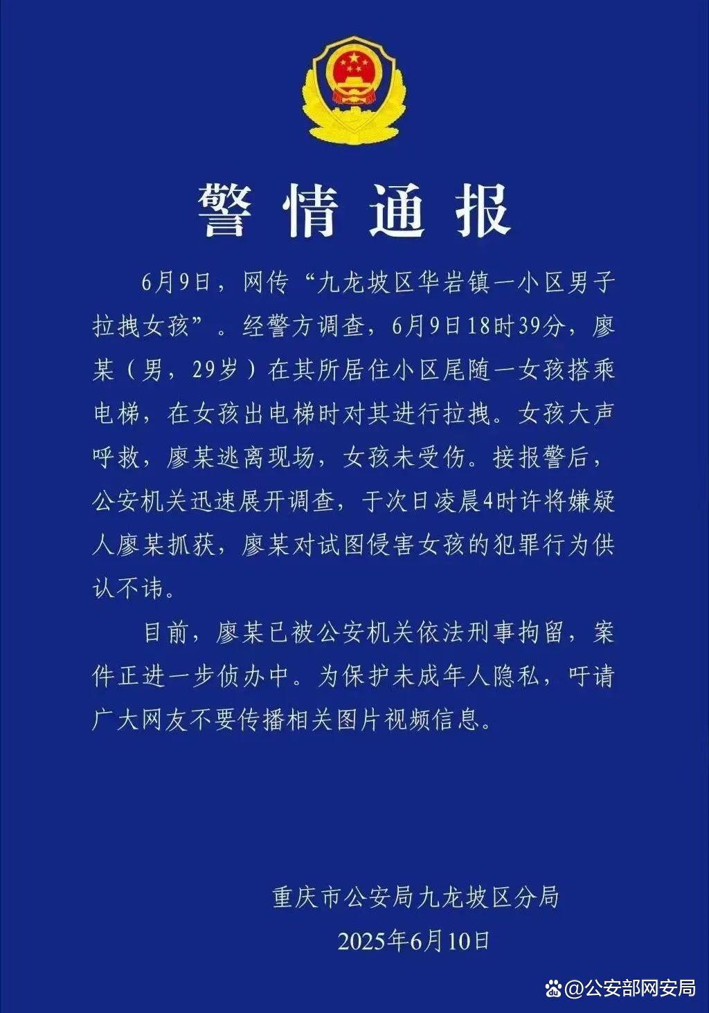 6月9日,重庆市九龙坡区发生一起“男子在电梯拉拽女孩,意图实施侵害”警情。
