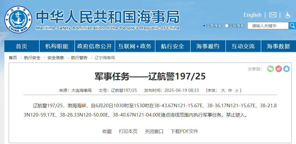 大连海事局发布航行警告,自6月20日10时30分至15时30分,渤海海峡部分海域执行军事任务,禁止驶入。