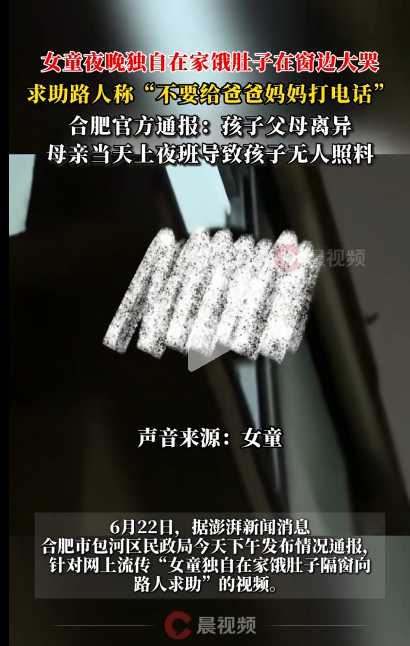 对此,合肥市包河区民政局22日下午发布情况通报:针对网上流传“女童独自在家饿肚子隔窗向路人求助”的视频,经调查了解,该女童家庭系单亲家庭,父母离异,其随母亲生活,母亲上夜班导致孩子晚上无人照顾。