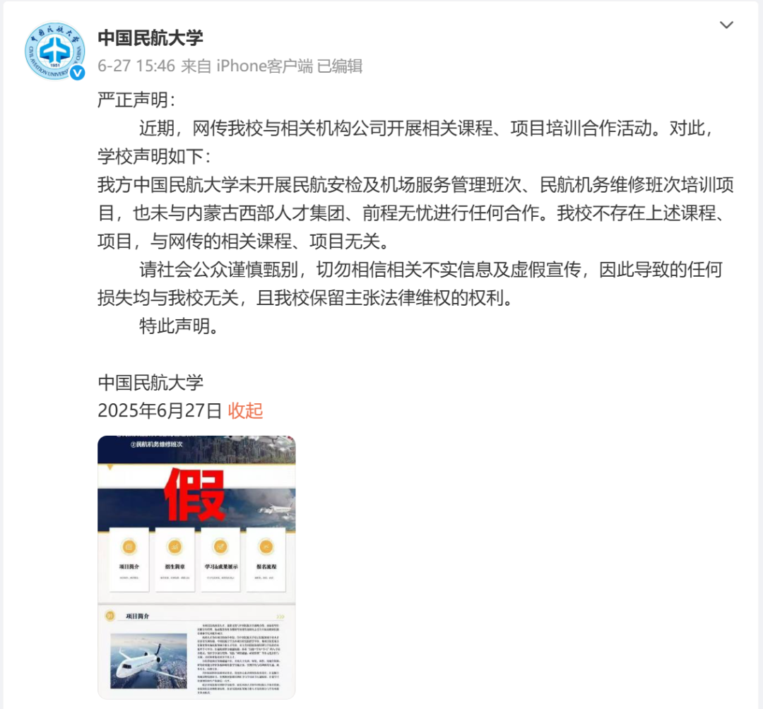 对此,中国民航大学27日发布严正声明称,学校未开展民航安检及机场服务管理班次、民航机务维修班次培训项目,也未与内蒙古西部人才集团、前程无忧进行任何合作。学校不存在上述课程、项目,与网传的相关课程、项目无关。