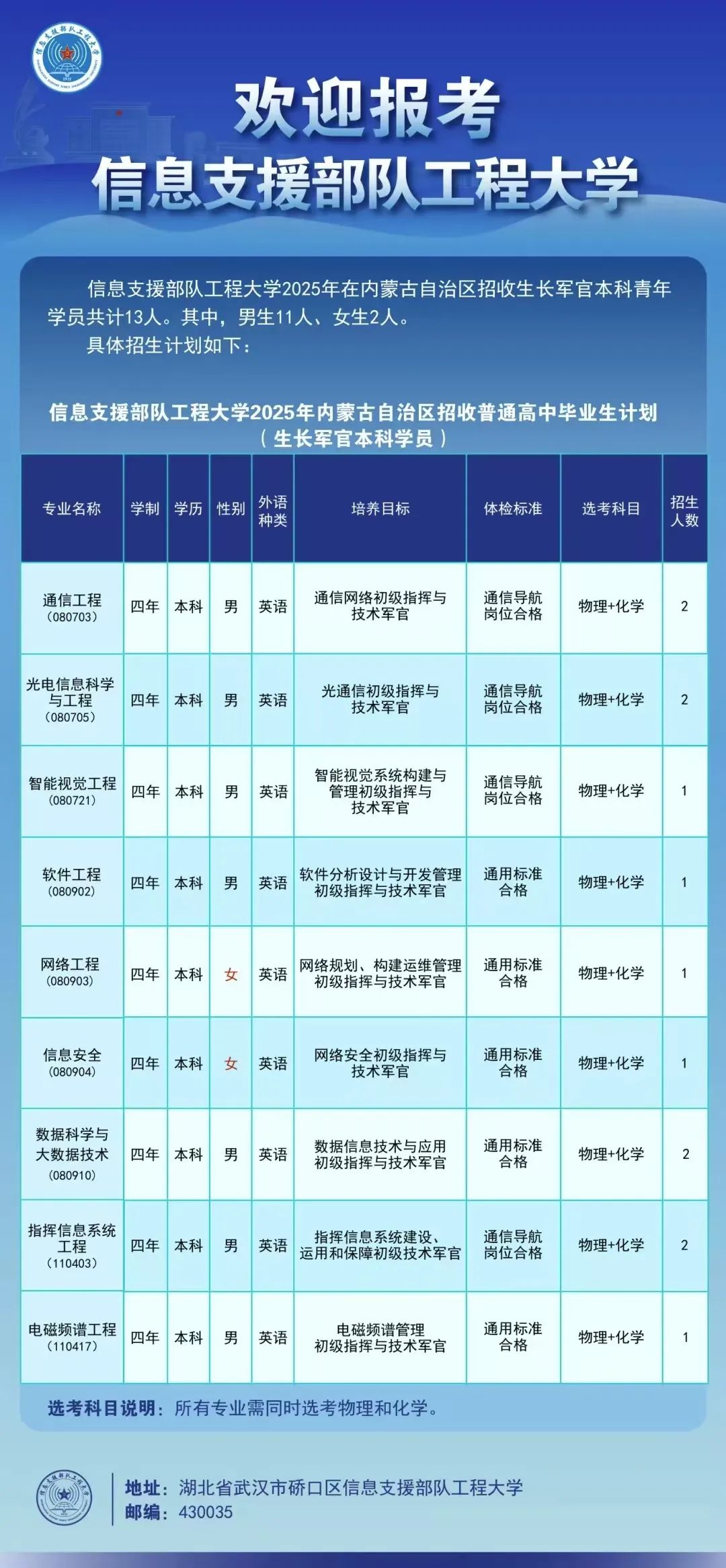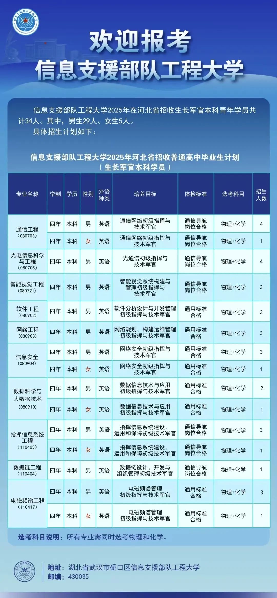 专业分别为通信工程、光电信息科学与工程、智能视觉工程、软件工程、网络工程、信息安全、数据科学与大数据技术、指挥信息系统工程、数据链工程、电磁频谱工程,均为物理类(理科),选考科目均为物理+化学。