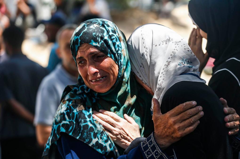 6月25日,巴勒斯坦人在加沙城一所医院悼念以军袭击中的遇难者。新华社发(马哈茂德·扎基摄)