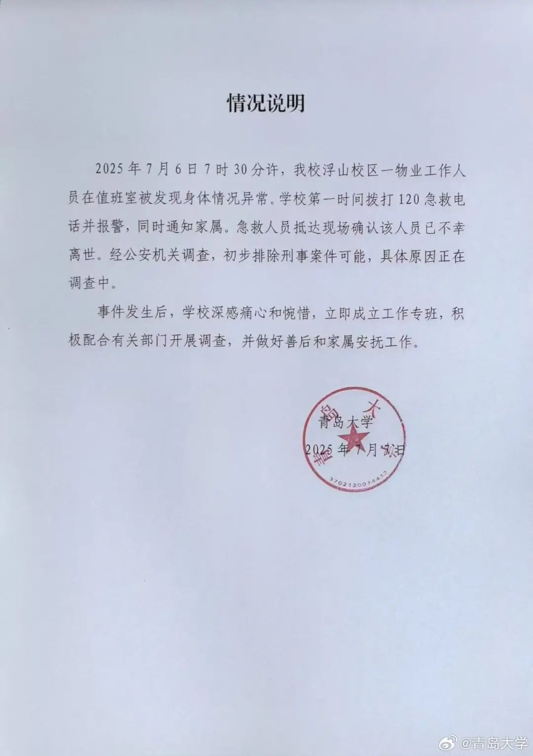 7月7日凌晨,@青岛大学 发布《情况说明》:7月6日7时30分许,我校浮山校区一物业工作人员在值班室被发现身体情况异常。学校第一时间拨打120急救电话并报警,同时通知家属。急救人员抵达现场确认该人员已不幸离世。经公安机关调查,初步排除刑事案件可能,具体原因正在调查中。