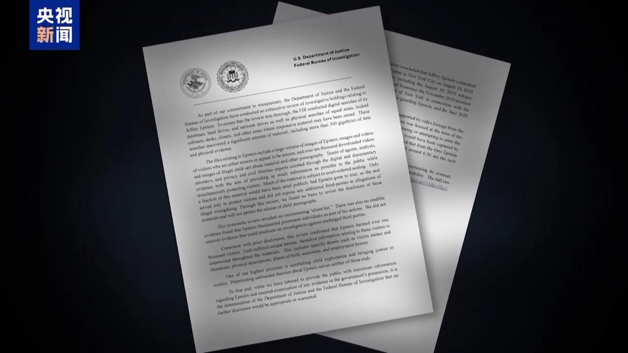 美国联邦调查局和司法部7日公布了时长11小时的爱泼斯坦牢房外视频,表示爱泼斯坦是在牢房中自杀,没有证据表明爱泼斯坦是被谋杀的。但是公布的视频却缺少了一分钟。联邦调查局和司法部联合公布的备忘录还称,没有证据表明爱泼斯坦保留了一份性侵丑闻相关的“客户名单”,也没有证据表明爱泼斯坦敲诈过知名人士。