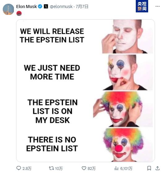 当地时间7日,在美国联邦调查局及司法部公布结论后,马斯克在X上发布一张小丑形象的梗图,回应美司法部对爱泼斯坦案的表态。
