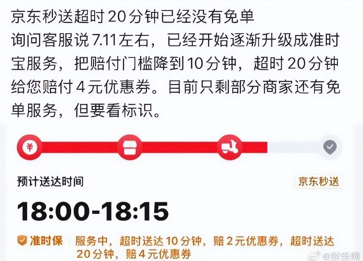 7月16日,据财经网:社交媒体上,不少用户发文称,京东外卖取消了曾被视为护城河的“超时20分钟免单”服务,改为了“超时20分钟赔付4元优惠券”。