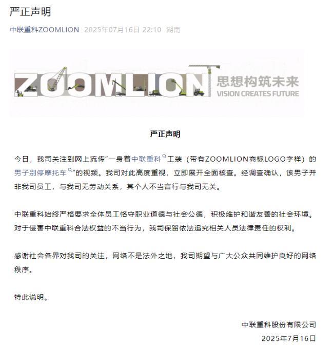 7月16日,中联重科在官网及公众号发布声明表示,公司关注到网上流传“男子驾车连续变道险酿事故 下车竟然还如此嚣张”的视频。公司对此高度重视,立即展开全面核查。经调查确认,该男子并非公司员工,与公司无劳动关系,其个人不当言行与中联重科无关。