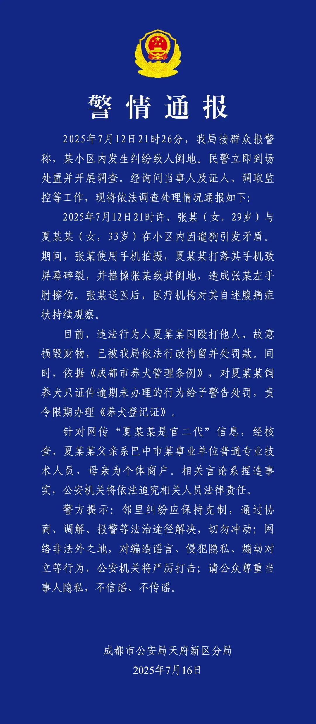 7月16日,成都市公安局天府新区分局发布警情通报: