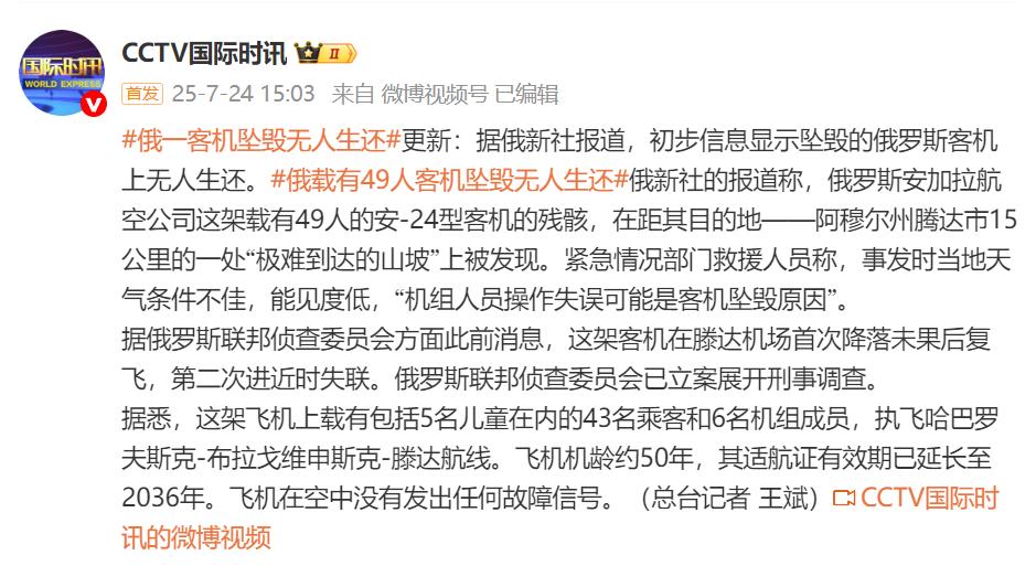 据悉,这架飞机上载有包括5名儿童在内的43名乘客和6名机组成员,执飞哈巴罗夫斯克-布拉戈维申斯克-滕达航线。飞机机龄约50年,其适航证有效期已延长至2036年。飞机在空中没有发出任何故障信号。(CCTV国际时讯)