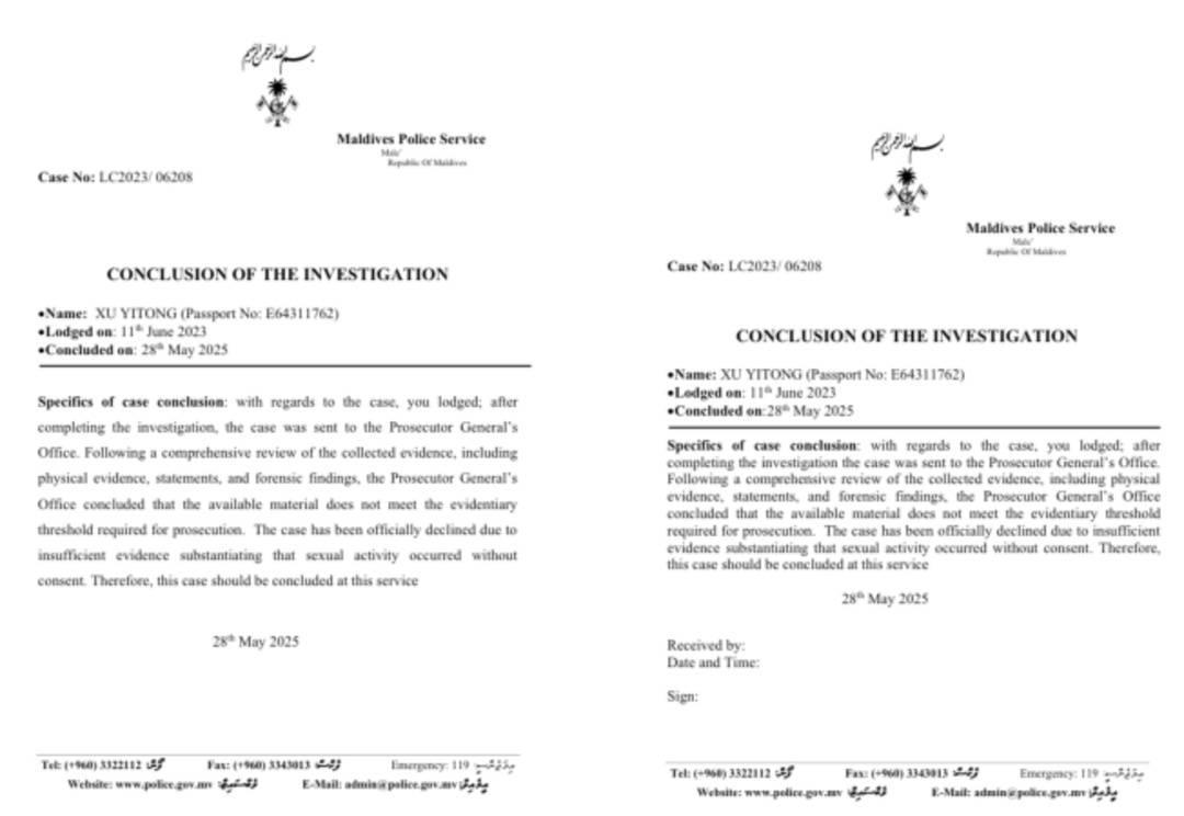 马尔代夫警方出具的最新调查结论。图源:受访对象