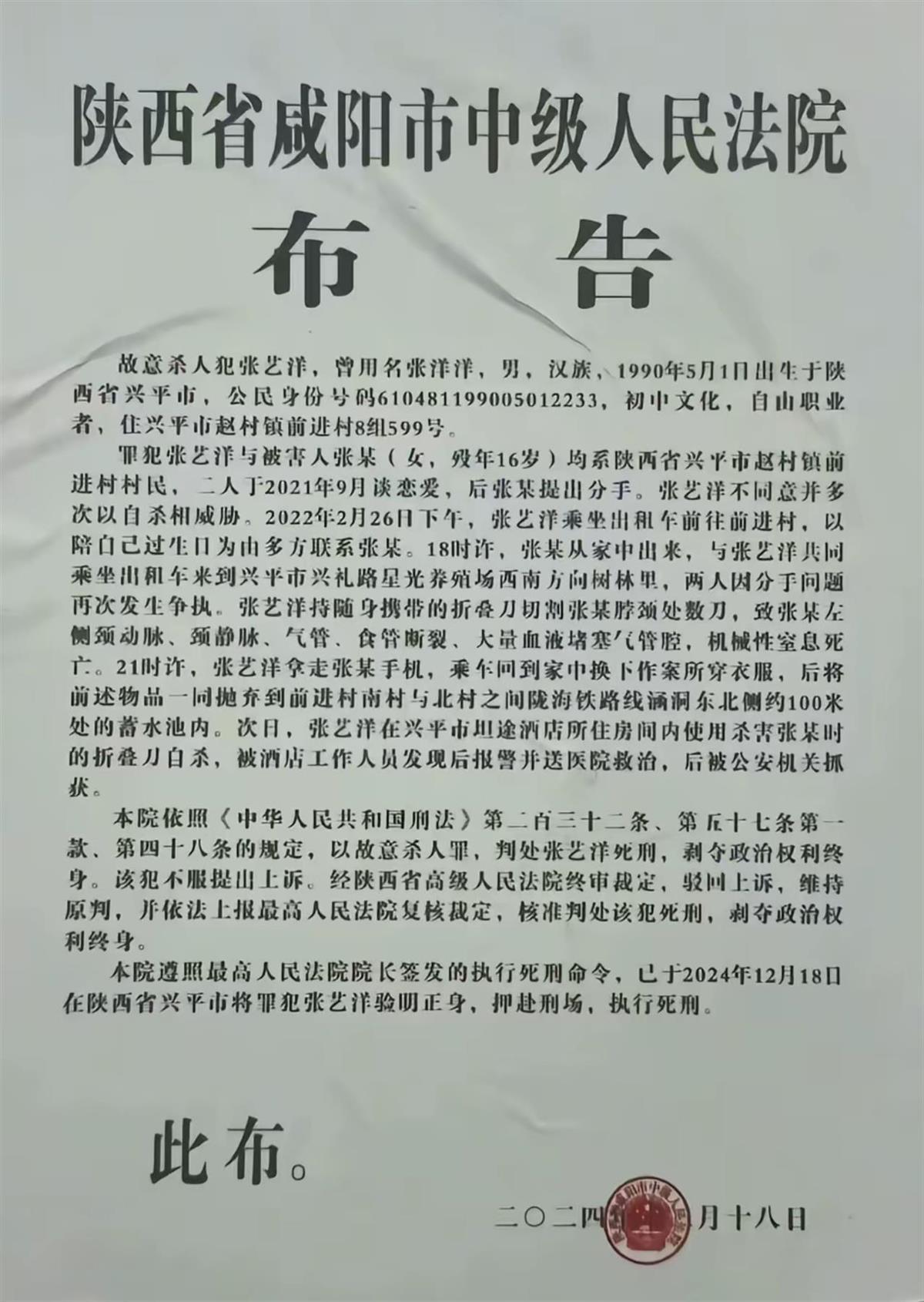 布告称,张艺洋与张姓女友从2021年交往,后女方提出分手,张艺洋不同意,并多次以自杀威胁。2022年2月26日下午,张艺洋以庆生为由,将16岁张姓女友诱骗至兴平市某树林,双方因分手问题再度发生争执。张艺洋持随身携带的折叠刀切割张女颈脖处数刀,导致颈动脉与气管断裂致死。案发后,张艺洋试图自杀未遂,随后遭警方逮捕。法院审理后,认定张艺洋行为手段残忍,社会影响恶劣,依法判处死刑,并于去年12月18日执行枪决。